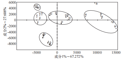 對(duì)不同地區(qū)生乳進(jìn)行PCA分析,結(jié)果如圖4所示。在PCA模型中,主成分貢獻(xiàn)率為(PC1:67.272%;PC2:27.608%),累計(jì)貢獻(xiàn)率能夠達(dá)到94.88%,因此主成分分析結(jié)果可以較好地代表樣品氣味信息。對(duì)其進(jìn)行區(qū)分后,樣品中達(dá)拉特旗生乳樣品(B)與巴彥淖爾生乳樣品(A)、和林格爾生乳樣品(C)及寧夏生乳樣品(E)在以PC2為區(qū)分軸時(shí)區(qū)分開,達(dá)拉特旗生乳樣品(B)在以PC2為區(qū)分軸時(shí)距離相對(duì)較遠(yuǎn),和林格爾生乳樣品(C)、涼城生乳樣品(D)及寧夏生乳樣品(E)與巴彥淖爾生乳樣品(A)以PC1軸作為區(qū)分。結(jié)果表明PCA分析能夠較好區(qū)分生乳氣味信息。