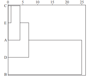 為初步判定峰面積較大的異丙醇、2-丁酮和環(huán)己酮含量對(duì)生乳地區(qū)歸屬的影響,以生乳中檢測(cè)的相關(guān)含量為變量,歐式距離平方為度量標(biāo)準(zhǔn),通過組間平均數(shù)聯(lián)結(jié)法完成聚類分析,結(jié)果如圖5所示。其中,和林格爾生乳樣品(C)與寧夏生乳樣品(E)先聚為一類,此類生乳異丙醇、2-丁酮和環(huán)己酮含量相對(duì)偏低,再與巴彥淖爾生乳樣品(A)聚為一類后與涼城生乳樣品(D)聚為一類,最后與達(dá)拉特旗生乳樣品(B)聚類,達(dá)拉特旗生乳樣品的各物質(zhì)含量較高。