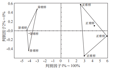 對(duì)生乳進(jìn)行DFA分析,結(jié)果如圖9所示,圖中橫、縱坐標(biāo)判別因子1、2累積區(qū)分指數(shù)達(dá)到100%,2種樣品未出現(xiàn)重合部分,且相距較遠(yuǎn)。8批生乳樣品均能得到有效分離,所有樣品按其性質(zhì)分為2類,結(jié)果表明,通過DFA能夠快速、有效地區(qū)分生乳和異常乳樣品,且區(qū)分效果良好。