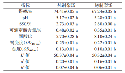 由表2可知,烤制雪花梨湯可滴定酸含量和濁度較低,pH和固酸比較高(P<0.05);燉制梨湯得率、可滴定酸含量和濁度較高,固酸比較小(P<0.05)。兩種梨湯的SSC和L*值均無顯著性差異;色澤方面,燉制梨湯色澤較為鮮亮,烤制梨湯的褐變度和a*值較小。