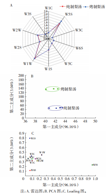 由圖1A可知,兩種梨湯在10種傳感器上的響應(yīng)各異,在W5S、W1W和W2W傳感器上的響應(yīng)值較大。由圖1B的PCA結(jié)果顯示,第一主成分(PC1)和第二主成分(PC2)的貢獻(xiàn)率分別為96.16%和3.04%,總貢獻(xiàn)率為99.20%,充分涵蓋了兩種梨湯樣品的主要信息,燉制梨湯和烤制梨湯能夠完全分離,說明其氣味具有明顯差異。Loading分析可用于判斷各傳感器對樣品的區(qū)分能力,各傳感器在某主成分軸上的特征向量絕對值越大,表示該傳感器對此主成分的貢獻(xiàn)率越大。由圖1C可知,傳感器W5S對樣品區(qū)分能力最佳,其次為W1W、W2W、W1S和W2S,其中W5S對第一主成分貢獻(xiàn)率最大,W1S對第二主成分貢獻(xiàn)率最大。