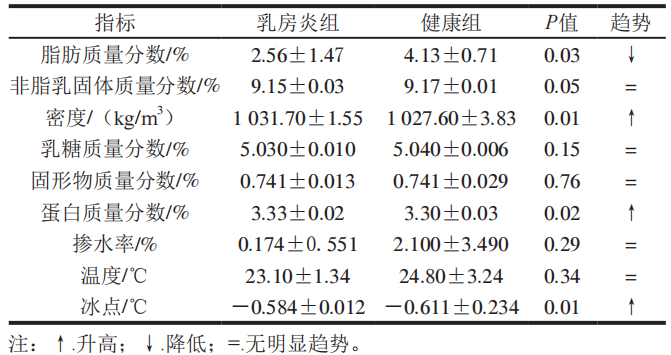 表1 乳房炎牛乳和健康乳成分含量及變化趨勢