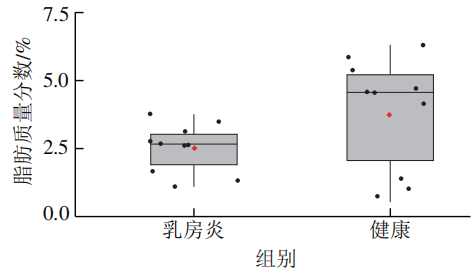 如表1和圖1所示,脂肪質量分數、密度、蛋白質量分數、冰點4 個指標P值均小于0.05,具有顯著差異,與健康組相比,乳房炎組牛乳脂肪質量分數顯著降低(P<0.05)。脂肪在體細胞數量較多的牛乳中顯著下降,可能是由于乳房發(fā)炎期間乳腺細胞合成和分泌能力下降。乳房炎牛乳中蛋白質含量增加,可能是由于奶?;既榉垦缀髸黾尤榉棵氀艿耐ㄍ感?,從而使蛋白含量增加。其余指標在兩種牛乳間差異不顯著(P>0.05)。