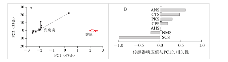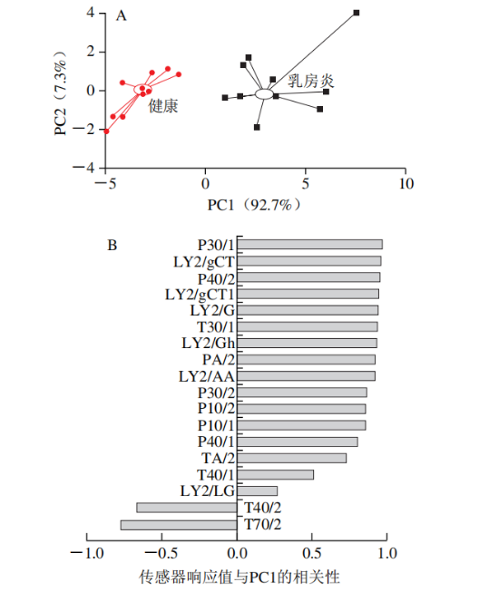 圖2 健康和乳房炎牛乳的電子鼻PCA得分圖(A)和載荷圖(B)