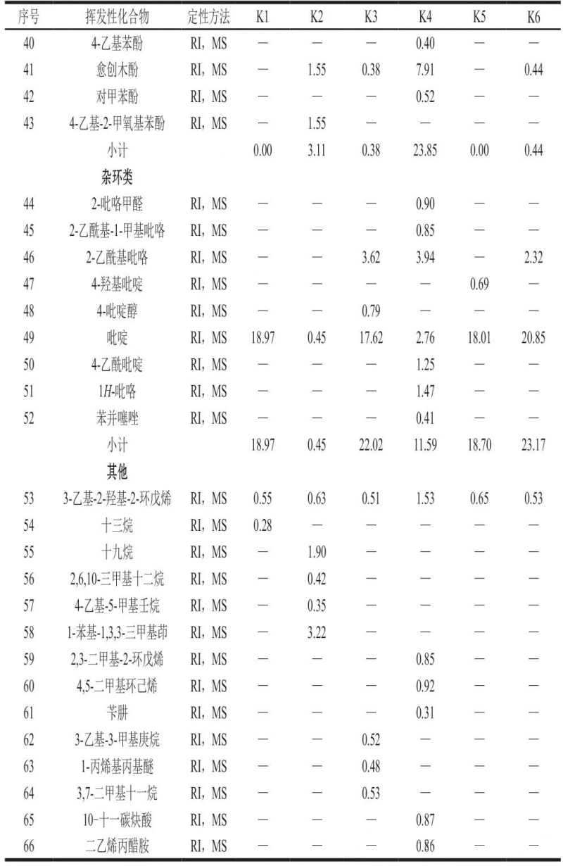 02 不同咖啡的滋味輪廓分析利用電子舌快速分析滋味輪廓,如圖2A所示。6種樣品的雷達圖輪廓類似,只有酸味傳感器的響應值為負,說明酸味對咖啡整體滋味的貢獻較小。各樣品在鮮味與咸味傳感器上的響應值差異最大,表明這兩種傳感器對滋味特征的區分效果最好。為根據滋味特征進一步區分6種咖啡,對電子舌傳感器響應值結果進行PCA(圖2B)。6種咖啡輪廓未重疊,滋味特征明顯,易被區分。K3、K5和K6咖啡在PC1的正方向,主要受鮮味、咸味、厚味影響;K1、K2和K4咖啡在PC1的負方向,主要由澀味、酸味、苦味影響(圖2C)。每個樣品聚類的距離與滋味特征接近度相關,有相同咖啡配比的K1~K4樣品,烘焙程度不同,距離較遠,說明電子舌可以區分不同烘焙度的咖啡。K5、K6咖啡分別與K1、K3咖啡輪廓接近,說明不同的咖啡配比在一定程度上能夠彌補烘焙程度的差異,使不同烘焙度的咖啡具有類似的滋味輪廓。