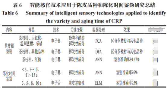 智能感官技術作為新興的快速分析技術,采用電子傳感器模擬生物的嗅覺及味覺系統,從而使樣品的檢測客觀化、智能化。其中的電子鼻和電子舌技術應用于陳皮品種和陳化時間鑒偽的研究總結見下表。