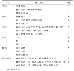 感官評定小組由江蘇省農業科學院豆類研究室的8名老師及研究生組成。采用9分嗜好法對菜用大豆進行感官評定,1、5、9分分別表示極度不能接受、一般、非常喜歡。結果表示為評分的平均值。感官評定標準詳見表1。