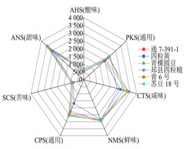 菜用大豆酸味、苦味、甜味、鮮味及咸味5種味覺屬性值見圖2。在5個味覺屬性中,菜用大豆鮮甜咸味較為突出。從鮮味值來看,蘇豆18號的鮮味的響應值為2947.47,高于其他5個品種的響應值。在甜味的響應值上,響應值范圍在2975.50~3472.11,各樣品甜味響應值從大到小依次為通7-391-1為3472.11、蘇豆18號為3427.22、邳縣四粒糙為3352.83、青6號為3344.78、青棵圓豆為3297.19、四粒黃為2975.50,與感官評價各樣品鮮甜味數值大小排序一致。從味覺響應值數據中我們還可以看出,電子舌分析的結果和感官評價評分的結果具有一定相關性。