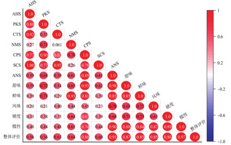 2.3電子舌和感官評價相關性分析利用皮爾遜系數對菜用大豆電子舌評價值和人工感官評價得分進行相關性分析,結果如圖3所示。從圖中可以看出,電子舌酸味與咸味和苦味呈極顯著正相關,相關系數分別為0.919、0.996。咸味與苦味呈極顯著正相關,r>0.930。同時,在感官評價中,發現對菜用大豆的整體評價與其甜味、鮮味、風味、硬度和糯性均呈現高度相關性。說明整體食用品質較好的菜用大豆,必然呈現鮮甜軟糯,具有大豆固有的清甜香味。值得注意的是,電子舌鮮甜味與人工感官評價的鮮甜味關聯度較高,電子舌鮮甜味與感官評價鮮甜味呈極顯著正相關,鮮味相關系數達0.926,甜味的相關系數達到0.983。說明電子舌與感官評價對菜用大豆的滋味品評具有一致性,尤其體現在菜用大豆的甜味和鮮味2個味覺屬性。