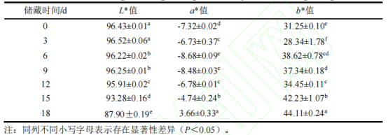 由表2可知,在貯藏18d后,漿水青稞奶茶色度整體呈現出L*值降低、a*值及b*值增加的現象,反映在感官上表現為奶茶光澤下降,色澤變紅、變褐,且時間越長,顏色變化越明顯。