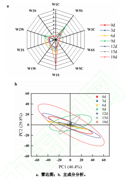 漿水青稞奶茶4℃貯藏過程呈味物質的變化如圖5所示。由圖5a可知,10個傳感器中對漿水青稞奶茶響應強度較大的傳感器有W1S、W5S、W2W,它們分別對應甲基類、氮氧化合物和有機硫化物的靈敏性。隨著貯藏時間的延長,第18天漿水青稞奶茶在W1S傳感器上響應值差異最為明顯,這可能是因蛋白質分解過程中產生了甲烷等物質物。為進一步明確不同貯藏期間漿水青稞奶茶風味特征的差異,對電子鼻傳感器的響應值進行了主成分分析(PCA)。由圖5b可知,4℃貯藏漿水青稞奶茶的第一主成分貢獻率為46.4%,第二主成分貢獻率為29.8%,累積貢獻率達76.2%,說明不同貯藏時間的奶茶樣本間揮發性氣味存在一定差異,其中第一主成分起到了最為關鍵的作用,使用電子鼻能夠準確識別和區分。而貯藏18d內奶茶氣味響應值空間距離較近,說明漿水青稞奶茶貯藏過程中風味輪廓未發生明顯變化,低溫有利于保持漿水青稞奶茶的風味的流失。