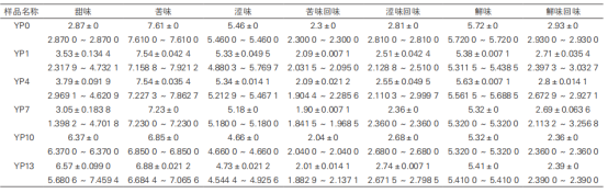 表1 三氯蔗糖與輔料矯味組合味覺信息測定值的均值 ± 標準差、95% 置信區間表2甜菊糖苷與輔料矯味組合味覺信息測定值的均值 ± 標準差、95% 置信區間表3阿斯巴甜與輔料矯味組合味覺信息測定值的均值 ± 標準差、95% 置信區間根據表1~3,選出甜味、鮮味、鮮味回味較高值的樣品,苦味、苦味回味、澀味、澀味回味較低值的樣品,即選出樣品 10、11、13、14 共 4 個樣品作為進一步研究的對象,篩選結果見表4。