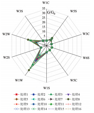 圖1是基于電子鼻技術(shù)對山櫻花16個處理的櫻花香氣組成成分響應(yīng)值構(gòu)建的雷達(dá)圖。從圖1可以看出,10個傳感器對櫻花香氣組分的響應(yīng)存在顯著差異(P<0.01),響應(yīng)值‘G/G0值’分布于0.9~29之間。W1C、W5S、W1S、W1W、W2W和W3S傳感器對櫻花香氣組分響應(yīng)值較大,響應(yīng)值從高到低依次為W1W、W2W、W5S、W1S、W3S、W1C,其余傳感器對櫻花香氣組分響應(yīng)值較小(G/G0值≈1)。因此,優(yōu)選出W1C、W5S、W1S、W1W、W2W和W3S傳感器進行數(shù)據(jù)提取與分析。