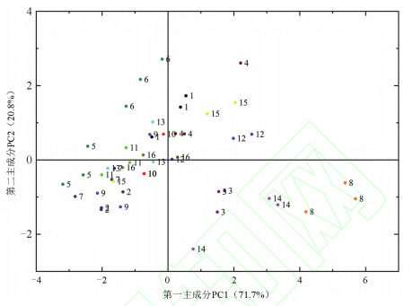 圖2是基于山櫻花香氣的電子鼻數(shù)據(jù)(W1C、W5S、W1S、W1W、W2W和W3S傳感器響應(yīng)值G/G0)構(gòu)建的主成分分析圖(PCA)。第一主成分PC1的貢獻率為71.7%,第二主成分PC2的貢獻率為20.8%,總貢獻率達(dá)到92.5%,說明第一、第二主成分能很好地反映供試樣品的整體信息。從圖2可以看出,3、6、8和14號處理組合與其他處理組合的樣本點沒有重疊,由此可以區(qū)分出3、6、8和14號處理。結(jié)合圖1可知8號處理各傳感器的響應(yīng)值顯著高于其他處理,且與其他處理差異極顯著。因此,8號處理,即A2B4C3D2處理組合(在12:00采集盛開時期的櫻花花朵4g,在頂空平衡30min后進行電子鼻測定)的表現(xiàn)最優(yōu),為電子鼻快速測定櫻花香氣的最優(yōu)組合。