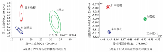 采用PCA和LDA法對3種櫻花進行分析(圖3),從圖3可以看出,不同種櫻花的樣本點沒有重疊,每種櫻花樣本點均有特定的分布區(qū)域。PCA結(jié)果顯示第一主成分PC1的貢獻率為99.33%,第二主成分PC2的貢獻率為0.49%,這兩個主要成分解釋了總方差的99.82%(圖3A),不同種質(zhì)區(qū)分度達(dá)到0.677~0.974。從LDA分析結(jié)果可以看出(圖3B),判別式LD1和判別式LD2的貢獻率分別為75.30%和23.95%,總貢獻率達(dá)到99.25%,稍低于PCA的總貢獻率(99.82%),但不同種質(zhì)區(qū)分度為1高于PCA分析的區(qū)分度,并且從LDA分析圖中發(fā)現(xiàn),每種櫻花樣本點相比于PCA樣本點更為集中。