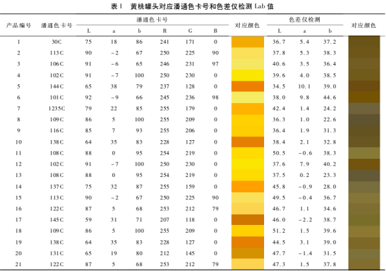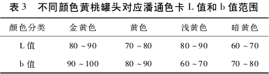 為了減少其他因素的干擾如品牌、價格、廣告、經驗等方面的影響,本實驗決定采用雙盲法進行檢驗。所有的樣品都用3個隨機的數字進行編碼,檢驗樣品也隨機化。在進行試驗之前罐頭要先打開5min,再將桃片放在白色瓷盤上。由訓練型評價員以潘通色卡為參比物,尋找和黃桃罐頭相對應的色卡,記錄下其Lab值和RGB值,然后再由訓練型評價員根據經驗,按照金黃色、黃色、淺黃色、暗黃色將其分為四類。