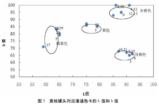 黃桃罐頭對應潘通色卡L值和b值分布見圖3,可以看出金黃色b值最大在90~100之間;淺黃色b值最小,在60~70之間,黃色b值在80~90之間,暗黃色b值在70~80之間。金黃色L值范圍80~90之間,黃色L值在70~80之間,淺黃色L值最大在80~90之間,暗黃色L值在60~70之間。