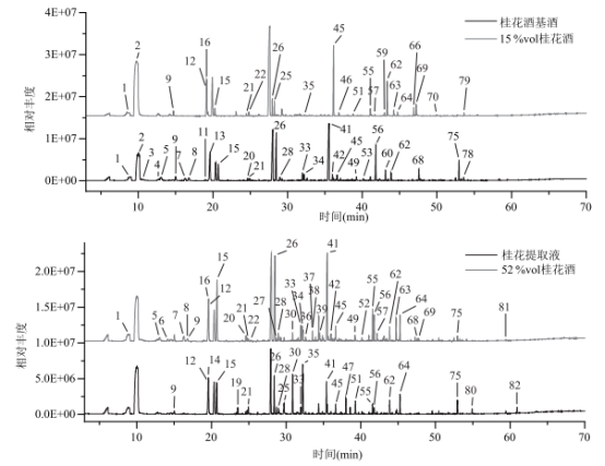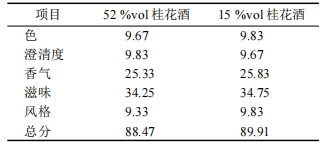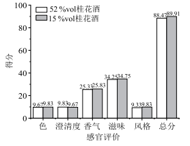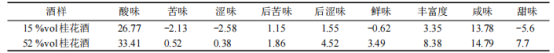 將自制52%vol桂花酒與市售15%vol桂花酒進(jìn)行人工感官對比評定,取平均分,結(jié)果見表2。由表2可看出,自制52%vol桂花酒在澄清度及酒體豐富度方面表現(xiàn)更好,市售15%vol桂花酒的香氣與滋味得分較高,且酒體風(fēng)格更具優(yōu)勢,說明52%vol桂花酒香味更加豐富飽滿,15%vol桂花酒的桂花風(fēng)格更加典型。