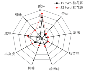15%vol市售桂花酒與自制52%vol桂花酒經(jīng)過電子舌滋味分析系統(tǒng)檢測后,結(jié)果如圖2和表3所示。由表5可知,自制桂花酒在酸味、咸味方面非常突出,有飽滿的豐富度,可明顯感知鮮味和后澀味,在苦味、澀味及后苦味方面感覺較弱;市售桂花酒除了在酸味、咸味方面非常突出,豐富度不如自制桂花酒飽滿,后苦及后澀味感覺較弱,且基本察覺不出苦味、澀味及鮮味,與不同桂花酒的感官評價(jià)較一致。
