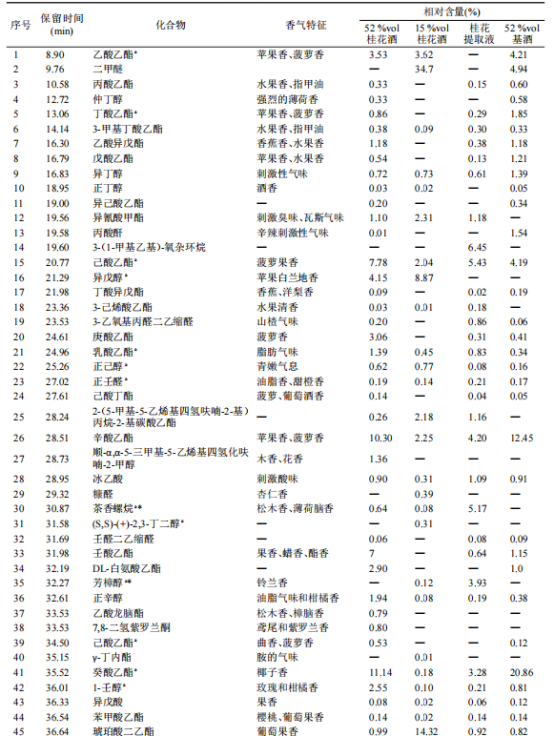 表3 不同桂花酒滋味強(qiáng)度值不同桂花酒香氣成分的GC-MS分析