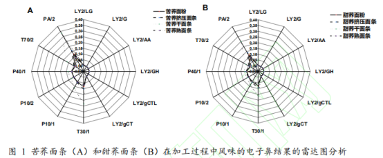 根據(jù)電子鼻各傳感器的數(shù)值,繪制了苦蕎面條和甜蕎面條在加工過程中的雷達指紋圖譜,從而比較面條在加工過程中的揮發(fā)性風(fēng)味物質(zhì)變化規(guī)律。如圖1所示,所有蕎麥粉及蕎麥面條在T30/1、P10/1、P10/2、P40/1、T70/2和PA/2這六個傳感器上的響應(yīng)值高,并具有相似的雷達指紋圖譜輪廓。PA/2、T30/1傳感器主要對有機化合物靈敏;P40/2、T40/2主要對氧化能力較強的物質(zhì)靈敏,T70/2主要對芳香族香氣較為靈敏,表明蕎麥粉及蕎麥面條揮發(fā)性風(fēng)味物質(zhì)主要為醛類、醇類、酸類、酮類、芳香類和烴類物質(zhì)。蕎麥粉經(jīng)擠壓和烘干后,特別是經(jīng)過烘干處理,所有傳感器上的響應(yīng)值均顯著增高。面條經(jīng)蒸煮后,所有傳感器的響應(yīng)值都顯著降低,甚至低于苦蕎粉,說明蒸煮過程導(dǎo)致了風(fēng)味物質(zhì)的散失。