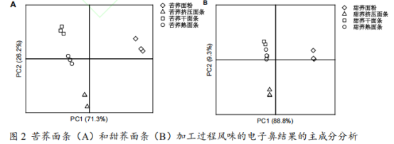 表1 苦蕎麥粉和甜蕎麥粉及其面條揮發(fā)性風(fēng)味物質(zhì)的GC-MS結(jié)果采用電子鼻和氣相色譜-質(zhì)譜聯(lián)用對全蕎麥面條在擠壓、烘干和蒸煮過程中的揮發(fā)性風(fēng)味物質(zhì)種類、含量及其整體風(fēng)味輪廓進行了系統(tǒng)研究。擠壓加工對苦蕎中醛類揮發(fā)性風(fēng)味物質(zhì)的形成有明顯促進作用,對烴類作用相反。面條經(jīng)烘干后,烴類相對含量繼續(xù)降低,醛類相對含量繼續(xù)增加。面條經(jīng)過煮制后醛類相對含量反而降低。甜蕎擠壓面條風(fēng)味物質(zhì)整體呈現(xiàn)類似的變化趨勢。在擠壓、烘干、蒸煮過程中,苦蕎擠壓面條中的醛類相對含量始終高于甜蕎擠壓面條,醛類閾值低,不僅使苦蕎面條的風(fēng)味更加濃郁外,還賦予苦蕎面條果香等獨特的風(fēng)味。