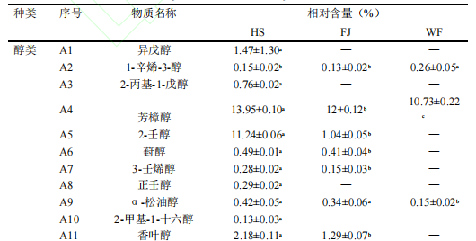 醇類在FJ、HS以及WF樣品中相對(duì)含量分別為26.36%、60.25%、13.32%。其中1-辛烯-3-醇、芳樟醇、α-松油醇為三組樣品共有物質(zhì),芳樟醇是三組樣品中相對(duì)含量最高的揮發(fā)性化合物,分別為FJ組(12%)、HS組(13.95%)、WF組(10.73%)。醛類物質(zhì)在FJ、HS以及WF樣品中相對(duì)含量為2.16%、1.43%、21.09%。并且WF組中醇類物質(zhì)相對(duì)顯著高于(P<0.05)其它兩組樣品。苯甲醛、正辛醛、苯乙醛、壬醛作為三組樣品共有物質(zhì)。酸類物質(zhì)樣品FJ(1.21%)、HS(0.63%)和WF(1.53%)中相對(duì)含量并不太高,且在WF中相對(duì)含量顯著高于(P<0.05)其他兩組。酯類物質(zhì)主要在WF組樣品中檢出,相對(duì)含量為57.39%,顯著高于(P<0.05)FJ組(7.72%)與HS(1.45%)組。酮類物質(zhì)在FJ和HS樣品中相對(duì)含量分別為60.24%和21.72%,而WF樣品中則并未檢測(cè)到此類物質(zhì)。其中2-壬酮為FJ于HS樣品中共有且相對(duì)含量最高的物質(zhì),可以為發(fā)酵后的濃汁貢獻(xiàn)花香與果香。其他揮發(fā)性物質(zhì)在三組樣品中共檢出8種,其中3,5-二叔丁基苯酚為HS、FJ、WF樣品共有揮發(fā)性化合物。