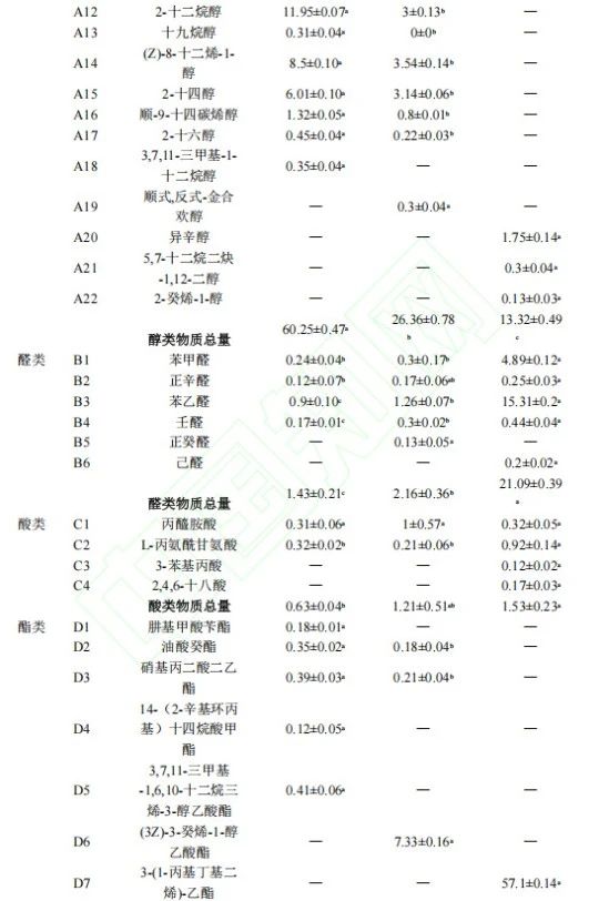 由表1可知3組樣品中共檢測(cè)出揮發(fā)性化合物57種,其中醇類22種、醛類6種、酸類4種、酯類8種、酮類9種、其他類8種。
