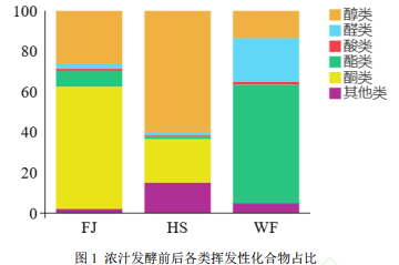 將FJ(發(fā)酵)、HS(后熟)、WF(未發(fā)酵)的濃汁樣品進(jìn)行GC-MS檢測(cè),揮發(fā)性化合物種類以及各類物質(zhì)在樣品中的占比見圖1。由圖1可知WF樣品中共檢測(cè)出5類揮發(fā)性化合物,分別為:醇(13.56%)、醛(21.48%)、酸(1.56%)、酯(58.44%)、其他(4.96%),其中主要揮發(fā)性物質(zhì)為酯類;FJ樣品中共檢測(cè)出6類揮發(fā)性化合物,分別為醇(26.45%)、醛(2.17%)、酸(1.21%)、酯(7.75%)、酮(60.45%)、其他(1.98%),其中酮類為主要揮發(fā)性物質(zhì);HS樣品中共檢測(cè)出6類揮發(fā)性化合物,分別為醇(59.92%)、醛(1.42%)、酸(0.63%)、酯(1.44%)、酮(21.60%)、其他(14.99%),其中醇類為主要揮發(fā)性物質(zhì)。