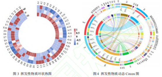 聚類熱圖與動(dòng)態(tài)Circos圖都可以結(jié)合大量數(shù)據(jù),以漸進(jìn)色帶和對(duì)應(yīng)顏色標(biāo)簽的占比形式共同將檢測(cè)得到的各揮發(fā)性化合物與三組樣品的相關(guān)性直觀的展現(xiàn)出來。結(jié)合圖3、圖4分析可知,在HS樣品中醇類(A)物質(zhì)相對(duì)含量及種類較多,其中包括芳樟醇(A4)、2-壬醇(A5)和2-十二烷醇(A12)等物質(zhì)。FJ樣品中酮類(E)物質(zhì)相對(duì)含量與種類相較另外兩組樣品較多,主要包括:2-壬酮(E3)、2-十一酮(E4)等物質(zhì)。WF樣品中醛類(B)與酸類(C)物質(zhì)占據(jù)主導(dǎo),其中芳樟醇(A4)、苯乙醛(B3)等物質(zhì)為濃汁本身提供了堅(jiān)果香氣與櫻桃香氣,并且酸類在其發(fā)酵過程中為其他風(fēng)味物質(zhì)的形成提供了前體物質(zhì)。這一結(jié)果與表1及PCA分析一致。