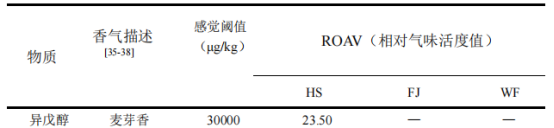 本實(shí)驗(yàn)通過對(duì)HS、FJ和WF樣品中的揮發(fā)性化合物進(jìn)行檢測(cè),共檢測(cè)出揮發(fā)性化合物57種,其中醇類22種、醛類6種、酸類4種、酯類8種、酮類9種、其他類8種。對(duì)3組樣品中揮發(fā)性化合物相對(duì)含量與種類進(jìn)行PCA分析與聚類分析發(fā)現(xiàn),HS組揮發(fā)性化合物數(shù)量較多,其中主要物質(zhì)為芳樟醇、2-壬醇和2-十二烷醇等物質(zhì);FJ組主要揮發(fā)性化合物為2-壬酮、2-十一酮等物質(zhì);WF組揮發(fā)性化合物種類豐富,其中酸類物質(zhì)與醛類物質(zhì)占據(jù)主導(dǎo),為后續(xù)風(fēng)味物質(zhì)的形成奠定了基礎(chǔ)。通過ROAV值大小對(duì)濃汁發(fā)酵前后關(guān)鍵風(fēng)味物質(zhì)進(jìn)行判定,發(fā)現(xiàn)HS與FJ樣品中關(guān)鍵風(fēng)味物質(zhì)種類幾乎一樣,分別為14種和13種;反觀WF樣品中關(guān)鍵風(fēng)味物質(zhì)種類較少,僅有7種,這說明經(jīng)過發(fā)酵后的馬鈴薯濃汁在關(guān)鍵風(fēng)味物質(zhì)方面具有顯著性改善。