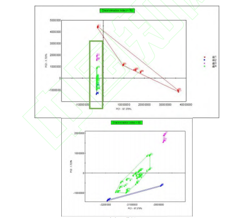 在分析不同種沒藥氣味差異標(biāo)志物時(shí),比對(duì)放大色譜圖以尋找樣品組間的差異往往繁瑣且復(fù)雜,這種方法雖然直觀,但效率低下、易出錯(cuò)。為了簡(jiǎn)化這一過程并提高分析的準(zhǔn)確性,本研究采用了一種“先統(tǒng)計(jì)后化學(xué)”的方法。首先,運(yùn)用PCA對(duì)樣品組間的氣味數(shù)據(jù)進(jìn)行深入挖掘。PCA能夠迅速定位到樣品間氣味的主要差異所在,通過降維處理,將復(fù)雜的數(shù)據(jù)集簡(jiǎn)化為幾個(gè)主要的成分,從而更容易識(shí)別出差異性色譜峰,在對(duì)色譜峰進(jìn)行了篩選時(shí),要選取那些區(qū)分度顯著、峰面積較大且分離效果良好的色譜峰。經(jīng)過篩選,樣品整體的氣味分布趨勢(shì)與未經(jīng)篩選前保持一致,可以充分證明所選的色譜峰能夠準(zhǔn)確地代表樣品整體的氣味特征。接著,借助AroChembase數(shù)據(jù)庫,對(duì)具有顯著差異的色譜峰進(jìn)行了詳細(xì)的定性分析,識(shí)別這些色譜峰中可能包含的化合物。
