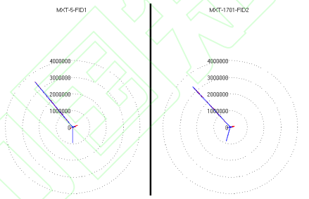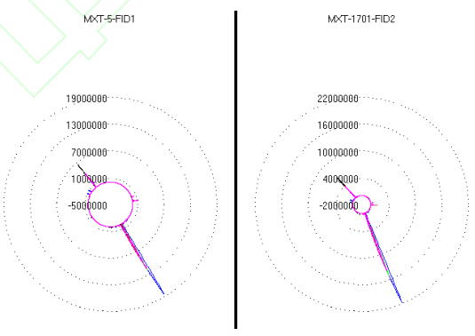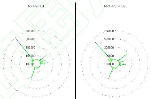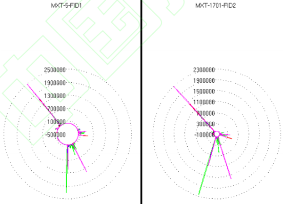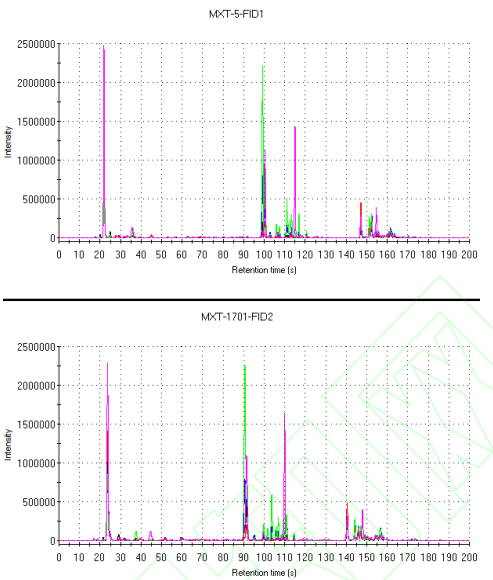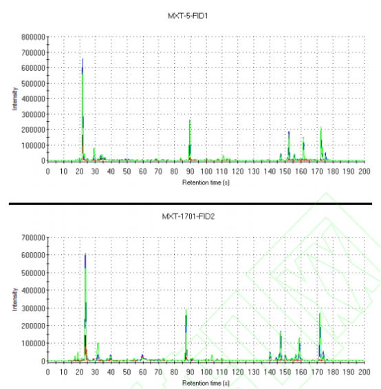 將GC數(shù)據(jù)進(jìn)行同組疊加處理可以更清晰地觀察組內(nèi)共有特征和細(xì)微差異,有助于識(shí)別同組樣本中普遍存在的化合物及其相對(duì)含量。圖2~圖9為各組(組1~組4)沒藥樣品原始GC疊加圖和雷達(dá)圖疊加圖,GC疊加圖分別展示MXT-5非極性毛細(xì)管柱與MXT-1701中極性毛細(xì)管柱結(jié)果,雷達(dá)圖也可以看出組間和組內(nèi)沒藥峰面積和保留時(shí)間的差異。組1(JZ1∼JZ4、JZ6)、組2、組3、組4(K1、M5、J1、W1、JZ5)在各自的GC疊加圖和雷達(dá)圖疊加圖中均呈現(xiàn)出相似特征:出峰時(shí)間差異不大、峰面積差異較大。