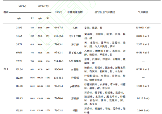 各組沒藥中可能含有的化合物信息及其氣味描述見表2。該表還提供了這些化合物在不同介質(zhì)中的氣味閾值數(shù)據(jù)。