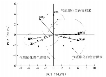 圖6 3種色澤氣流膨化青稞米的電子眼PCA圖