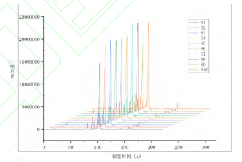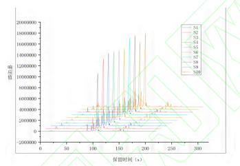 利用電子鼻對10種不同產地草果樣品進行的檢測分析及后續(xù)數(shù)據(jù)處理,獲得了在MXT-5色譜柱和MXT-1701色譜柱上的氣味指紋圖譜,結果如圖2、圖3所示,觀察到不同產地草果的氣味成分色譜峰在出峰時間和峰面積上均呈現(xiàn)出明顯差異。若通過比對放大色譜圖來尋找樣品組間的差異,此過程較為繁瑣與復雜。為了提高分析效率,故采用先統(tǒng)計后化學分析的方法,首先,通過PCA法對不同產地草果樣品的氣味進行統(tǒng)計分析,識別氣味上的差異。在PCA分析的基礎上,進一步確定差異色譜峰。隨后,利用AroChembase數(shù)據(jù)庫對這些差異色譜峰進行定性分析。
