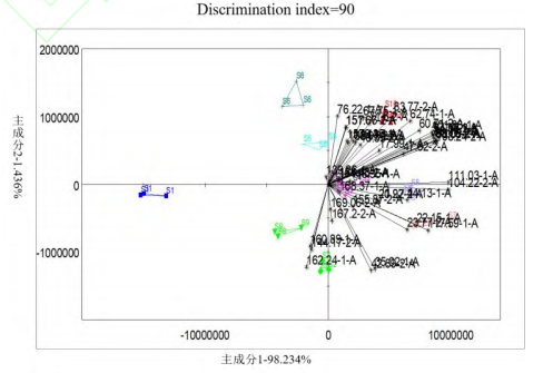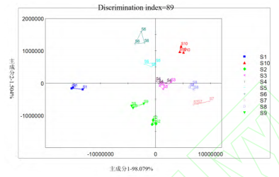 主成分分析(Principal Component Analysis,PCA)是一種常用統(tǒng)計分析方法,它可以將多個變量轉換為少數(shù)幾個主成分,從而簡化數(shù)據(jù)分析。本研究使用PCA算法對電子鼻采集的原始數(shù)據(jù)進行分析,通過計算主成分識別指數(shù)(Discrimination Index,DI)和貢獻率來識別變量。通過PCA分析,可以有效地揭示不同產地草果樣品氣味特征的差異。第一主成分(PC1)與第二主成分(PC2)的區(qū)分貢獻率之和為99.58%(圖4),表明這兩個主成分足以解釋10種不同產地草果樣品間的絕大部分的氣味差異,驗證了PCA模型能夠非常好地反映不同產地草果樣品間的氣味差異。識別指數(shù)(DI)是一種量化指標,用于衡量數(shù)據(jù)集或實驗結果中不同樣品或樣本之間的區(qū)分度。DI的數(shù)值大小直接關聯(lián)于數(shù)據(jù)集中樣本間的差異性。DI值越大,表示數(shù)據(jù)集中不同樣品或樣本之間的區(qū)分度越高,即模型或實驗方法的區(qū)分效果越好。草果樣品在主成分分析圖上的DI值達到89,進一步表明基于氣味特征的差異可以有效地區(qū)分10種不同產地的草果樣品。