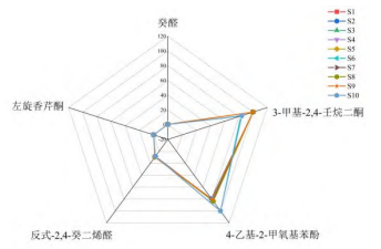 揮發(fā)性化合物對食品氣味的貢獻不僅取決于其含量,還受到嗅覺閾值的影響。含量相同的兩種化合物,同種介質中閾值越低則氣味越強。對于含量不同,閾值不同的兩種物質,則可以計算其ROAV值,從而評估不同化合物對草果氣味的具體貢獻,確定其在形成草果特有氣味中的重要性。基于峰面積歸一化法計算得到相對含量,以及通過AroChembase數(shù)據(jù)庫查詢得到嗅覺閾值。表5為云南西雙版納草果中主要差異揮發(fā)性化合物ROAV與氣味描述分析結果,ROAV值位于1至100范圍內的化合物有三種,分別是4-乙基-2-甲氧基苯酚、3-甲基-2,4-壬烷二酮和反式-2,4-癸二烯醛,這些化合物對草果的氣味特征起到關鍵作用。ROAV值介于0.1至1之間的兩種化合物,癸醛和左旋香芹酮,對草果的氣味特征起到重要的修飾作用。結合這些化合物的氣味描述,得出草果的主要氣味特征包括辛辣、柑橘、酚醛、刺鼻和脂肪等味道。而關于新鮮草果的氣味描述主要為柑橘、草藥、辛辣、松樹、水果、脂肪等,結合兩者可知,草果鮮果和草果干果兩者氣味相似均有辛辣味、脂肪味等。