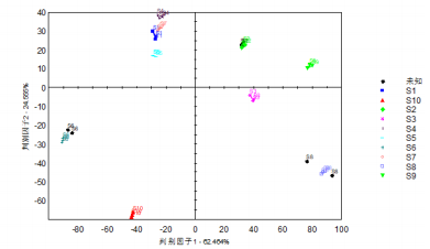 在主成分分析基礎上,對10種不同產地草果樣品進行判別因子分析,分析結果如圖8顯示,判別因子1判別指數(shù)為62.46%,判別因子2判別指數(shù)為24.56%,不同產地草果樣品組內分布集中且離散程度小,組間分布離散程度大,表明該分析方法能夠有效地區(qū)分不同產地的草果樣品。進一步地,將3種不同產地的草果未知樣本的圖譜信息投射到已建立的DFA模型中,每種未知樣本均設置了兩組重復。如圖8所示,通過模型判定,3種未知樣本分別被準確歸類到S2、S6和S8三個不同的產地。具體到每個未知樣本,歸屬于S2產地的樣本識別準確率分別為98.9%和99.2%,歸屬于S6產地的樣本識別準確率分別為95.5%和94.2%,而歸屬于S8產地的樣本識別準確率分別為81.7%和97.2%。這些結果表明,DFA模型對于未知草果樣品的判別具有較高的準確性。因此,基于DFA模型的分析,可以快速而準確地鑒定草果的產地,為草果的產地溯源提供了一種有效的技術手段。