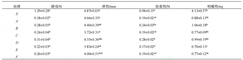 羊肚菌復水后的色差值△E順序為A處理>B處理>C處理>F處理>E處理>D處理,A、B、C處理的色差值△E與新鮮羊肚菌X無顯著性差異(P>0.05),說明這幾種干燥處理方法對羊肚菌的顏色影響相對較小,能夠保證羊肚菌復水以后的外觀色澤,有利于商品性的提升。